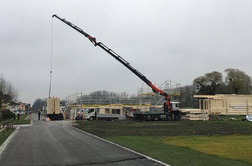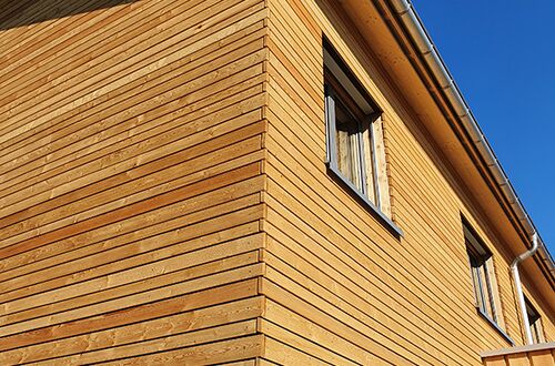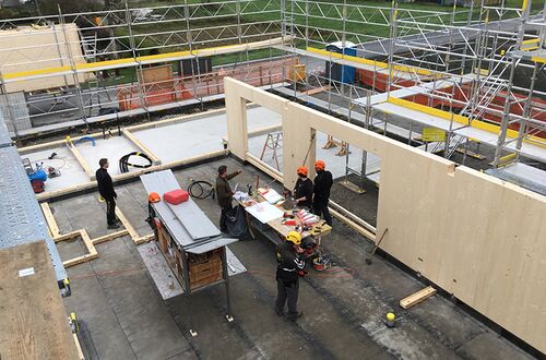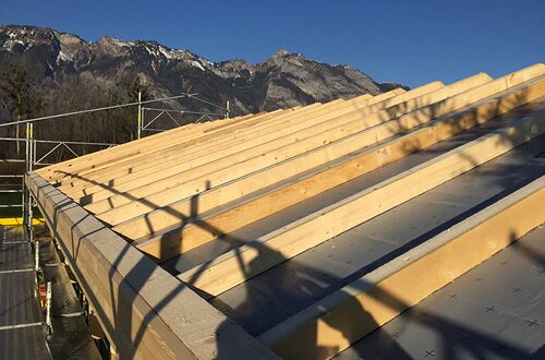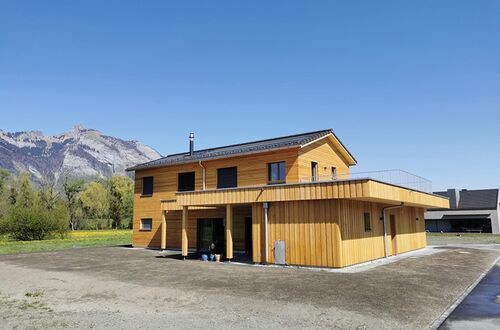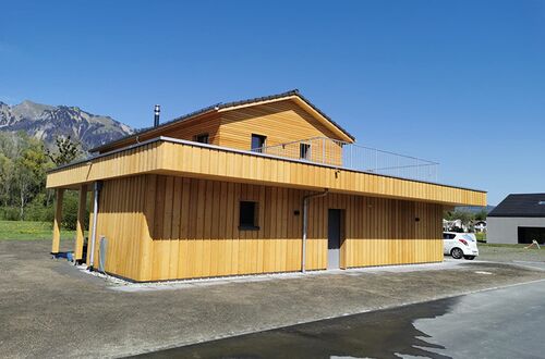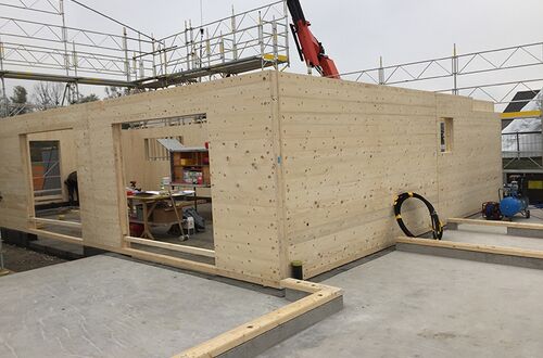 Sämtliche Wände und Decken sowie die Dachkonstruktion sind in Massivholzoptik als Element produziert. Bei den Innenwänden kamen Ständerwände zum Einsatz, welche entweder mit Lehm oder mit einer Holzschalung beplankt wurden.