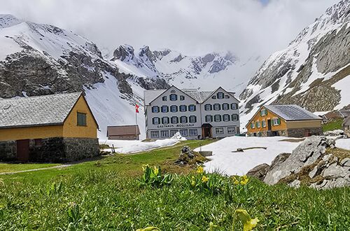 Nur drei Wochen nachdem der letzte Gast im alten Berggasthaus bedient wurde, stand der Neubau der Gaststätte auf der Meglisalp. Innert fünf Tagen wurden 410 Holzelemente auf die Meglisalp geführt, wofür insgesamt 352 Helikopterflüge vom Tal via Seealpsee unternommen wurden.