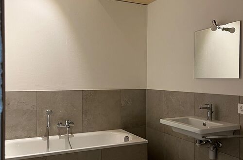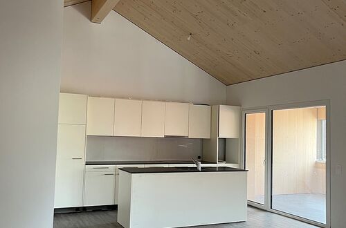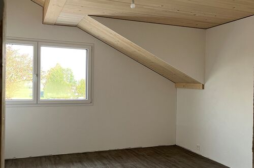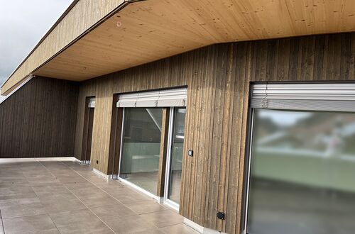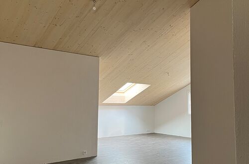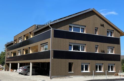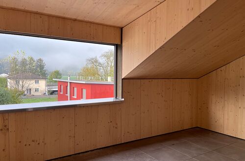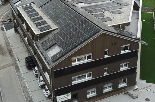 Die 5-eckige Gebäudekomposition besteht aus einem Teil mit Sattel- und einem mit Flachdach und wird von einer umlaufenden Holzfassade mit integrierter Photovoltaikanlage umspannt.